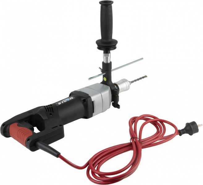 Бесщеточная дрель для сухого алмазного сверления с микроударом Bycon DB-132 (Байкон ДБ-132) – алмазная дрель с микроударом для сухого алмазного бурения отверстий Ø 10 – 102 мм в бетоне, железобетоне, "легком" бетоне, шлакобетоне, кирпиче и других особенно твердых материалах при высокой рабочей скорости; как с использованием станины, так и "с рук"; для профессионального использования. Отличный вариант как для монтажников кондиционеров, так и для электриков. С дополнительными переходниками позволяет работать как алмазными коронками стандартной длины, так и коронками для подрозетников.