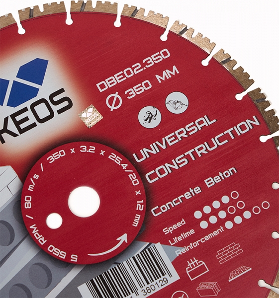 Диск алмазный сегментный Keos Universal Construction 350 мм (Кеос Универсал Констракшен 350 мм) предназначен для резки бетона, железобетона и кирпича на бензорезах, электрических резчиках и плиткорезах, каменерезных станках, стенорезных машинах, швонарезчиках, как с подачей воды, так и всухую.