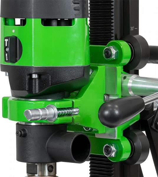 Установка с микроударом для сухого алмазного бурения Eibenstock DSE 162 (Айбеншток ДСЕ 162) предназначена для ручного и стационарного сухого сверления отверстий оптимально Ø 82 – 162 мм и максимально Ø 82 – 202 мм с микроударом в особо твердых материалах, например, таких, как: железобетон, высокоплотный силикатный кирпич и кирпичная кладка, каменная кладка; под углом до 45°; без подачи воды; с высокой рабочей скоростью; при создание отверстий в стенах и потолках в системах водоснабжения, отопления и вентиляции, где условия на площадке не позволяют проводить мокрое сверление (полые потолки и т. д. / предотвращение повреждения водой).